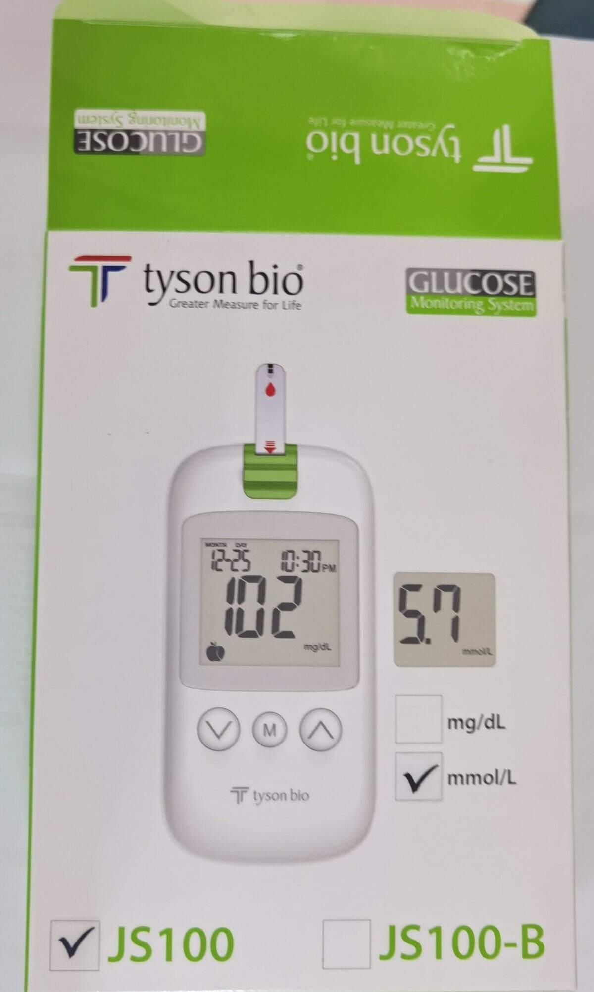 - What is Tyson Bio JS100 used for? Tyson Bio JS100 is used for self-monitoring of blood glucose levels. It is suitable for individuals who require regular blood sugar checks as part of their diabetes care routine.